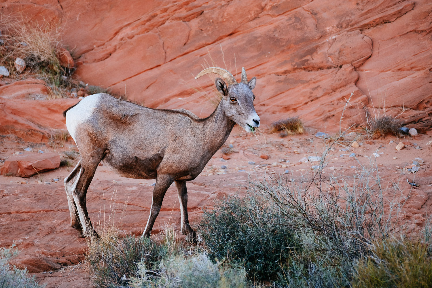 After an early breakfast we left Las Vegas at sunrise. Just after we paid the entry fee I spotted the first bighorn sheep right opposite of the parking lot. Four big rams. Yes, that’s what male bighorn sheep are called, also the name of the trucks from Dodge. First I spotted only the one in front of the bush and then I realised that there are three more slightly behind. I was lucky that two of them looked straight at me before the slowly walked off.