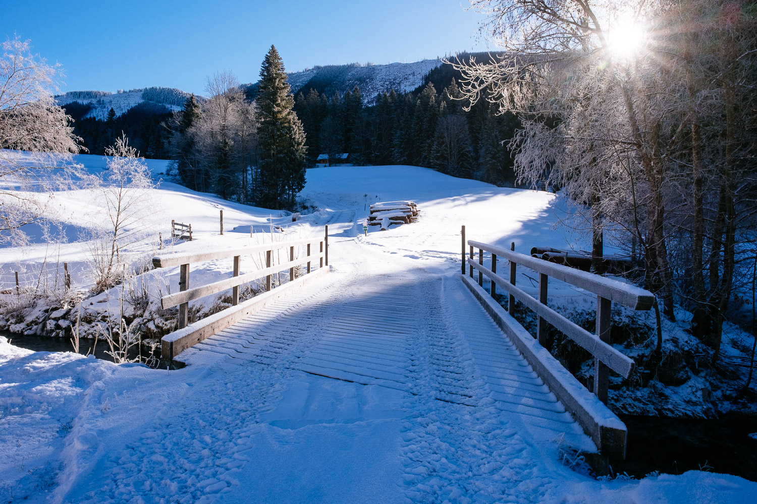 On the way to the town is a place we visited a couple of times ago. It a bridge over a small creek that partly lies in the shadow all day. So it is even colder there and a good place to take pictures of frost. Last time I took pictures at this place the temperature was -16 degrees Celsius. This time it was only -8 degrees but that still feels cold when you step out of your cosy heated car. And cold compared to the 15 degrees Celsius we had just a couple of days ago.