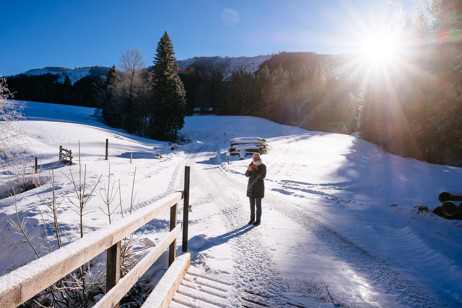 And I have a brand new camera so we had to go out to take some winter shots. There is a place we go at least once every winter usually to flee from the fog that plaques the lower altitudes and this place is called Mariazell. It’s a small town in the mountains, a place of pilgrimage, with a beautiful church and small sale booths. That day we had blue sky too at home but no snow so we went there.