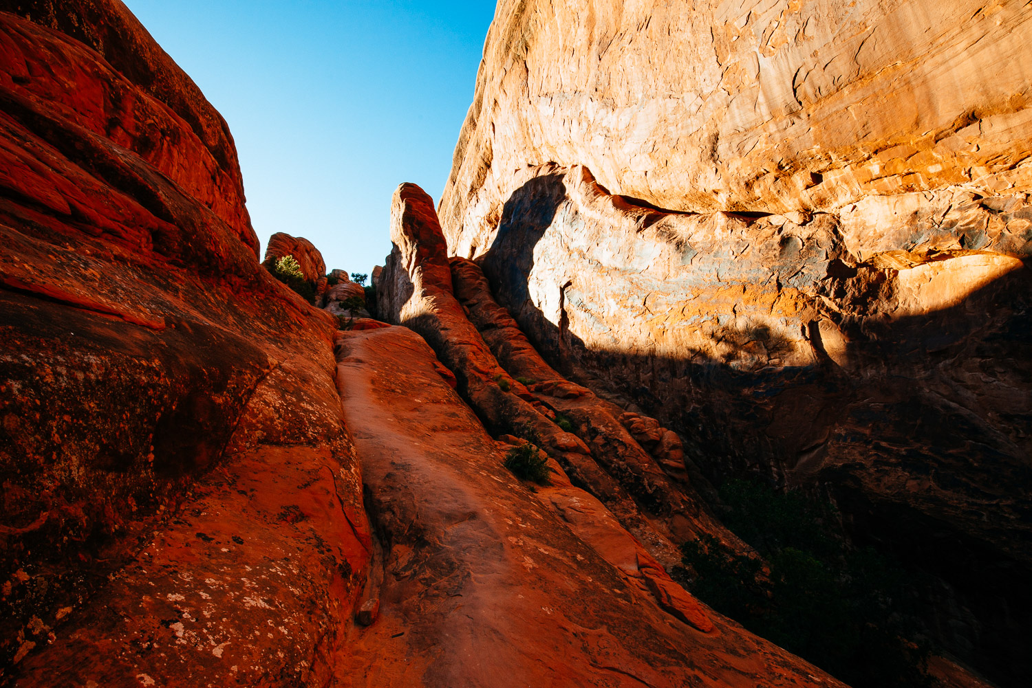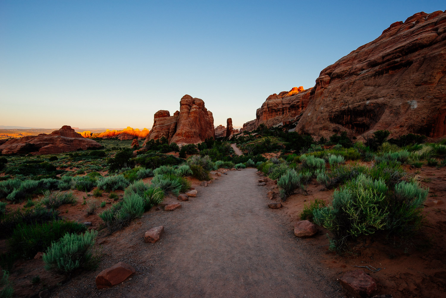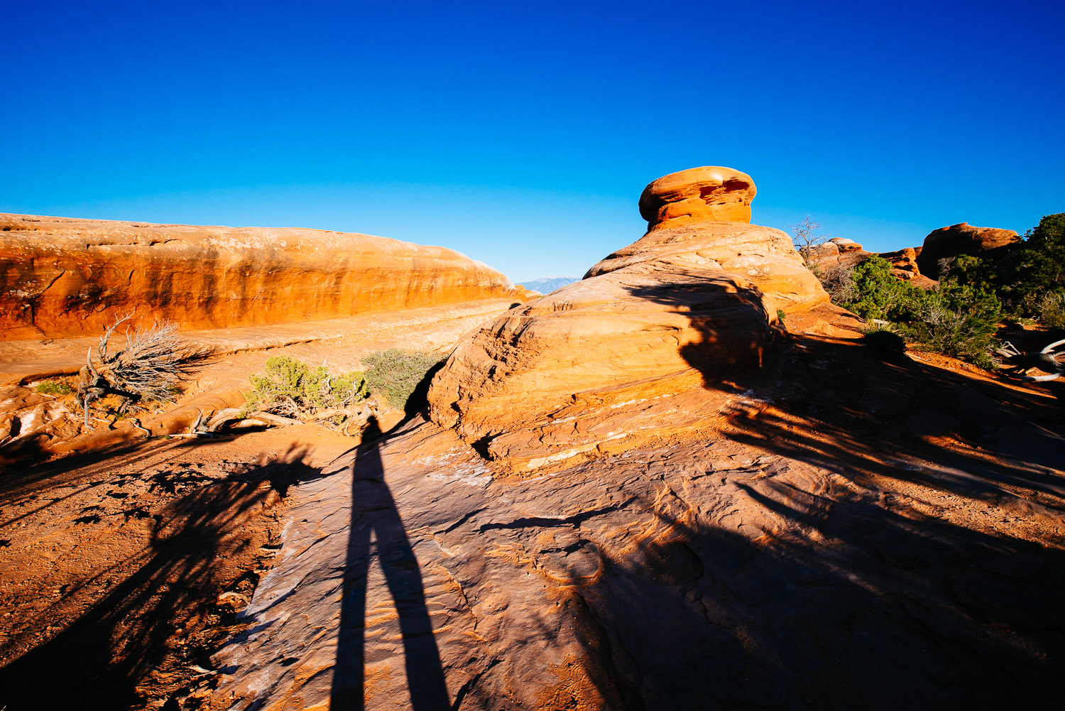 The last path to the parking lot was already in the shade as the sun was about to set. As soon as the sun is gone the desert comes to life and we saw dozens of small grey rabbits hop around in this unreal landscape. It was pure magic! For a moment I regretted that I didn’t bring the Canon 6D plus the 70-200/2.8 for this hike because there was no way to take a picture of the rabbits with my ultra wide angle lens.