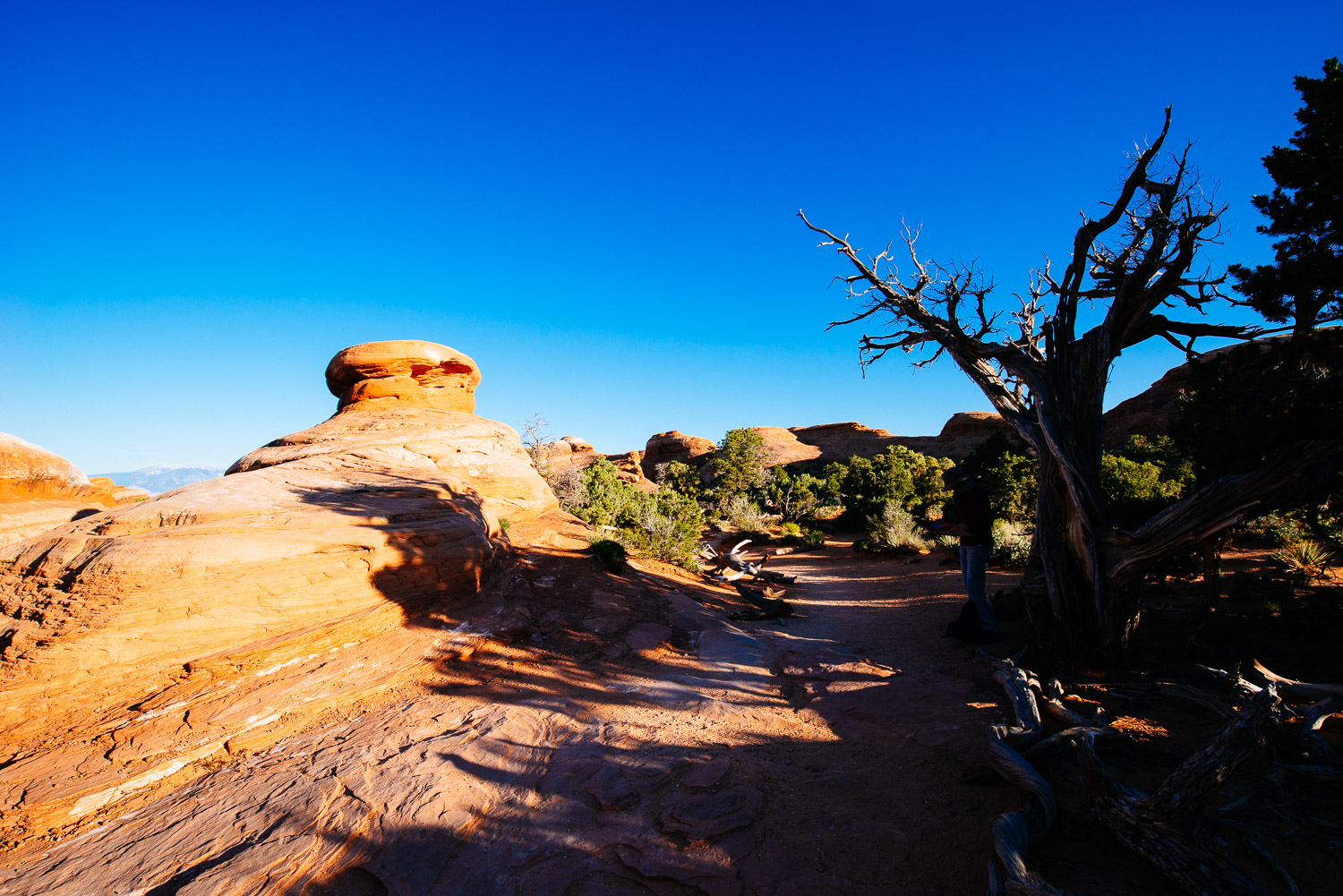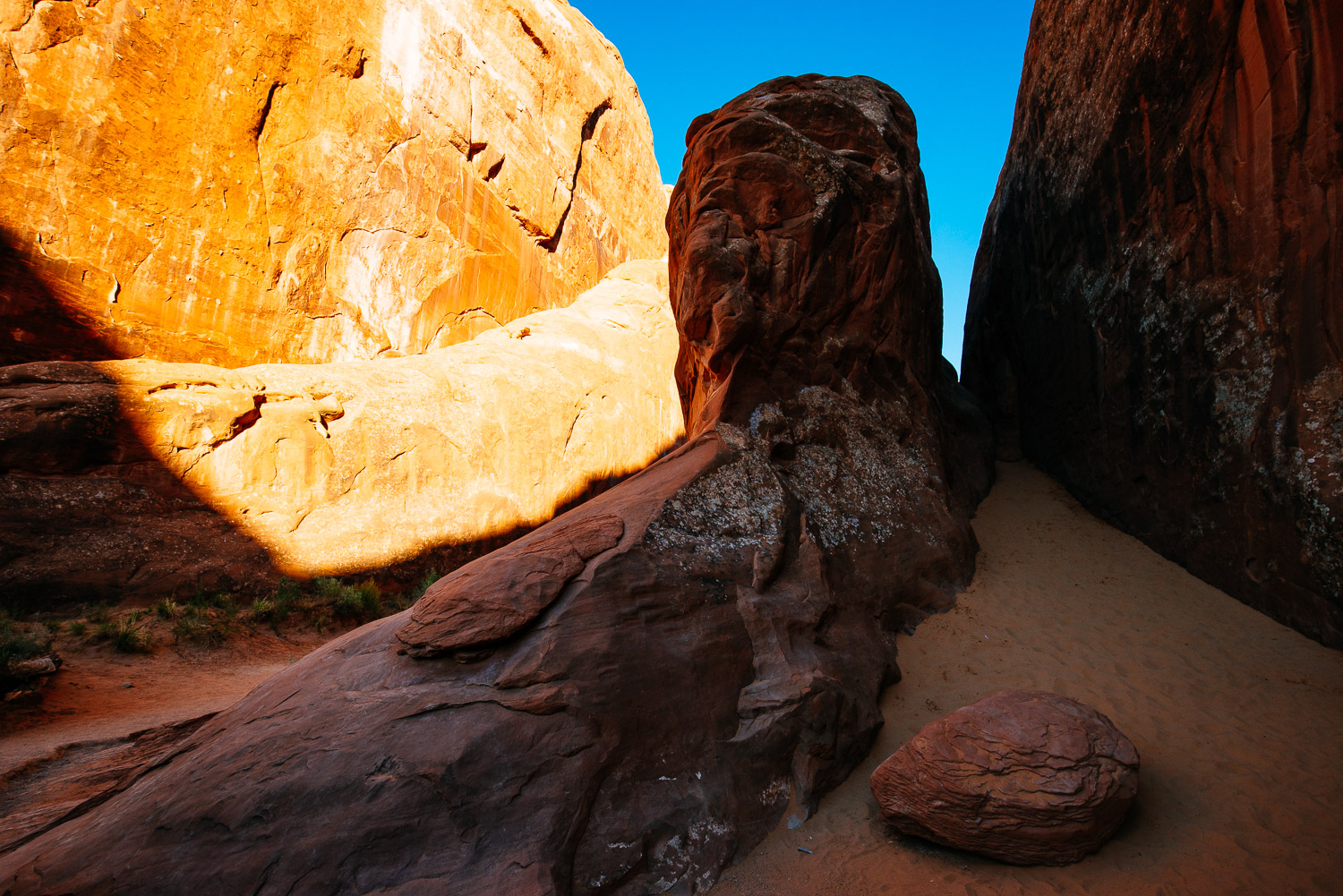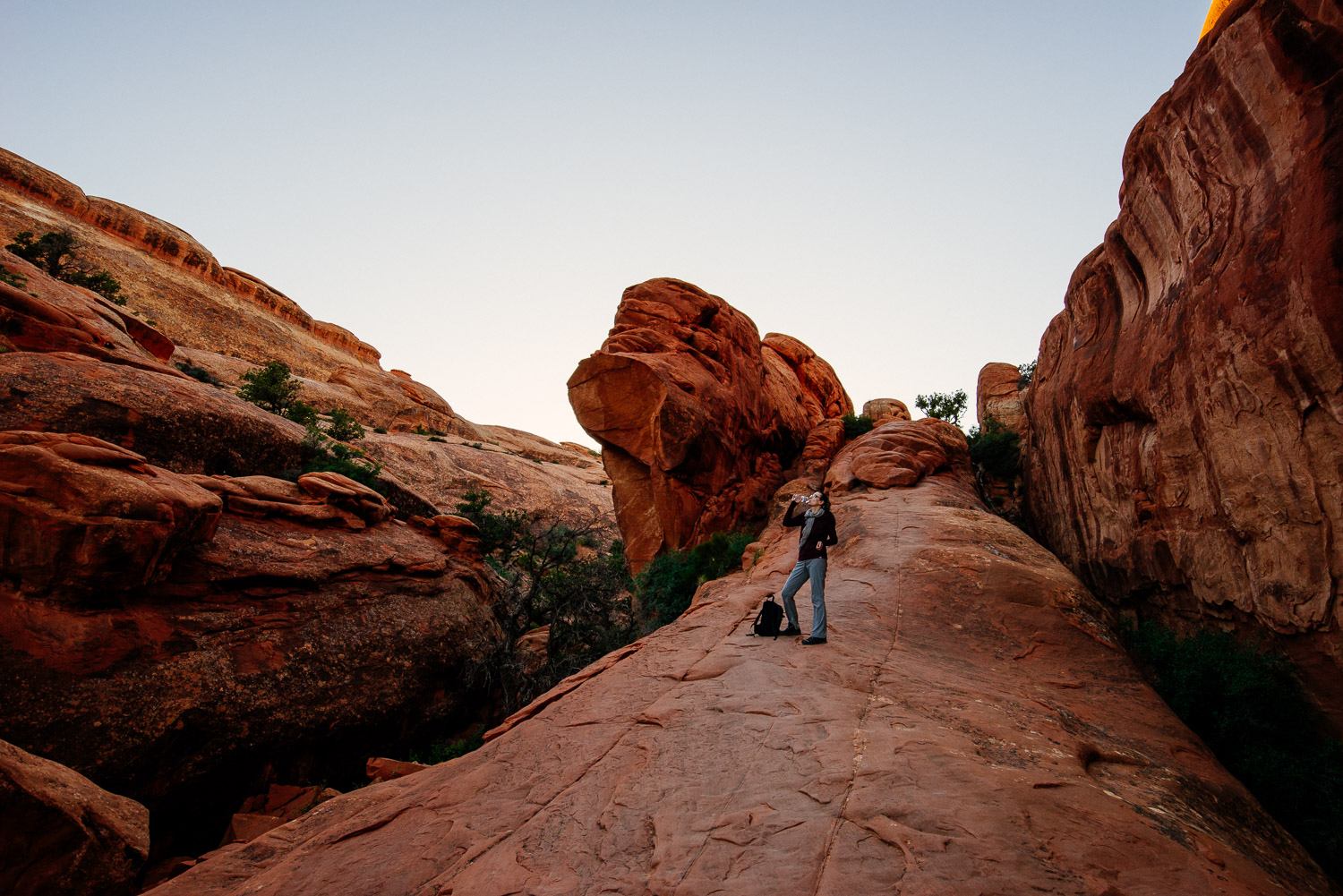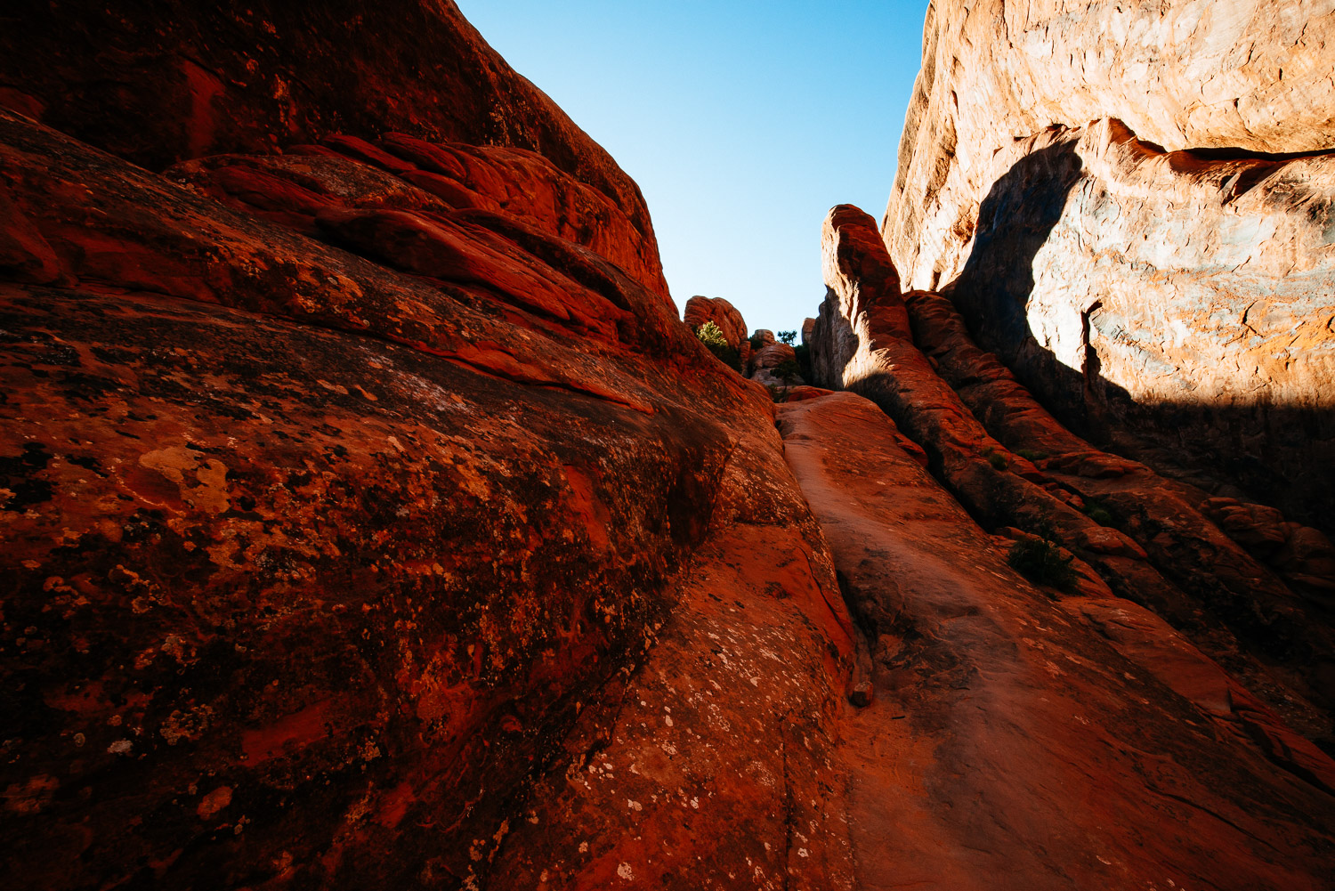 The last path to the parking lot was already in the shade as the sun was about to set. As soon as the sun is gone the desert comes to life and we saw dozens of small grey rabbits hop around in this unreal landscape. It was pure magic! For a moment I regretted that I didn’t bring the Canon 6D plus the 70-200/2.8 for this hike because there was no way to take a picture of the rabbits with my ultra wide angle lens.