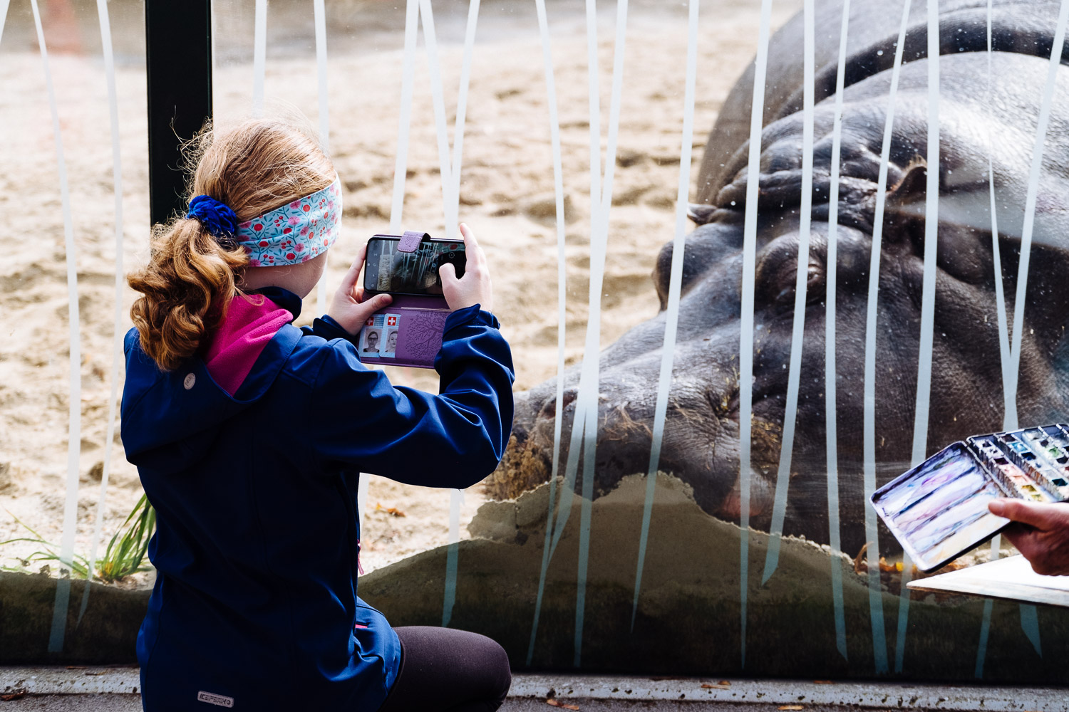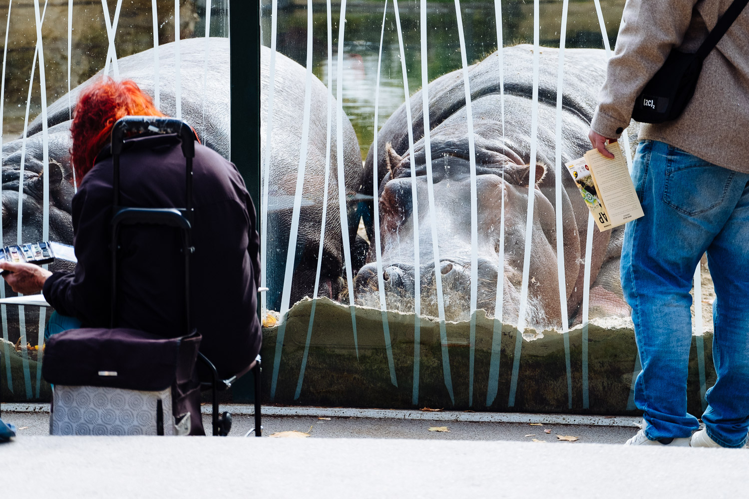 I usually try to focus on the animals and exclude the visitors as good as I can but sometimes the opposite makes sense. Like the people at the giant panda enclosure staring at their phones. Or the little girl looking at the gigantic hippo.