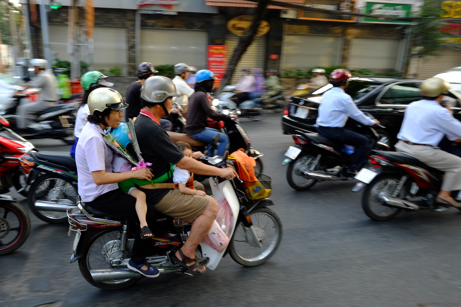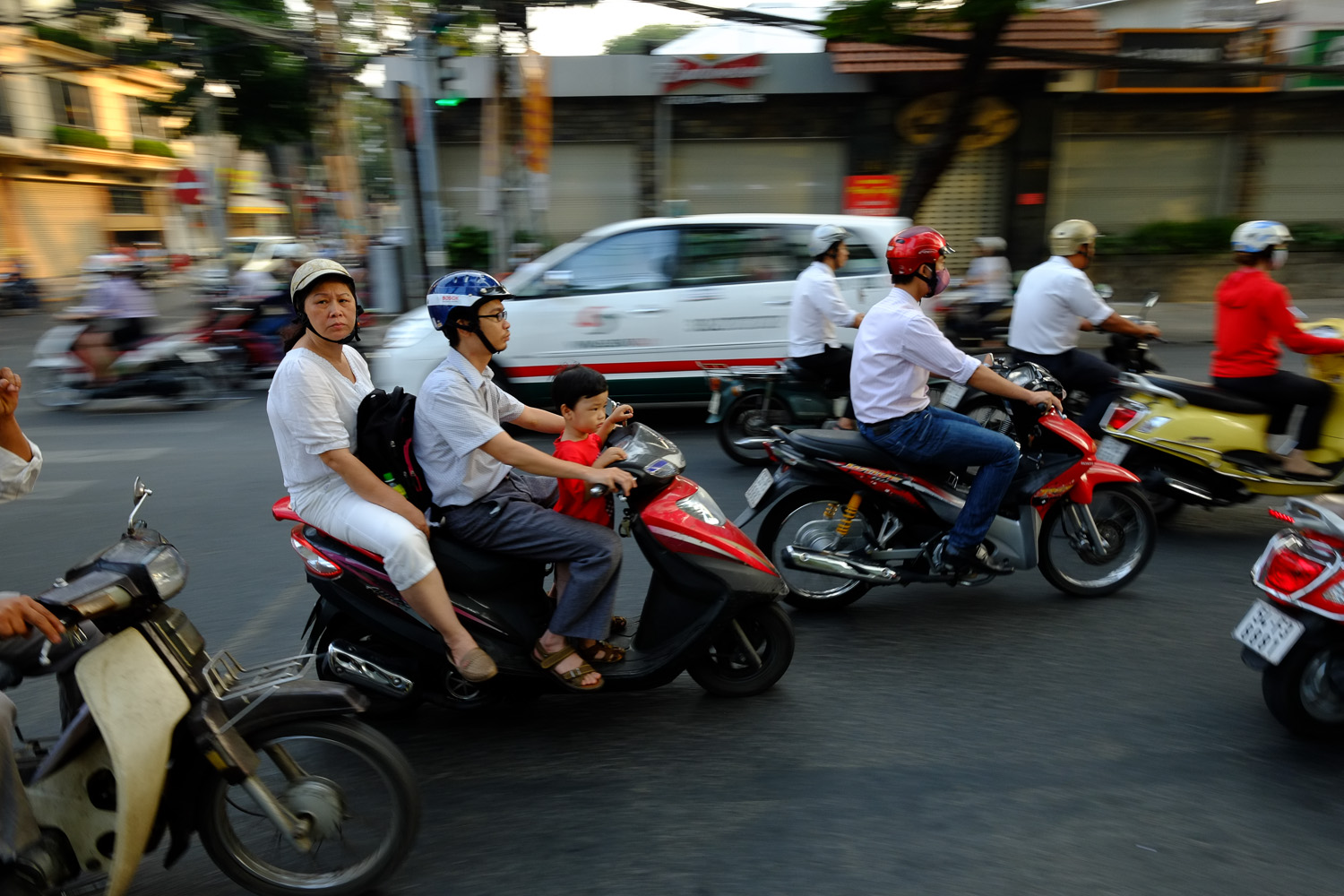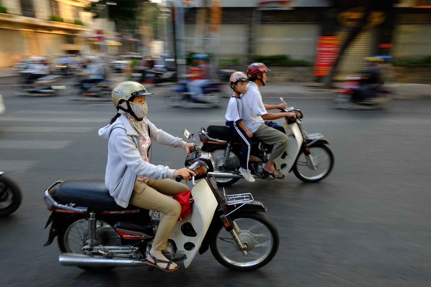 Before breakfast I went out of the hotel and start shooting the endless stream of people on motorbikes passing by. I always wanted to take these pictures. To give them a more dynamic look I decided to use a longer shutter speed of 1/60s (I changed to 1/125s later). To avoid AF I shot in M-Mode, chose a aperture of f8 and set focus manually.