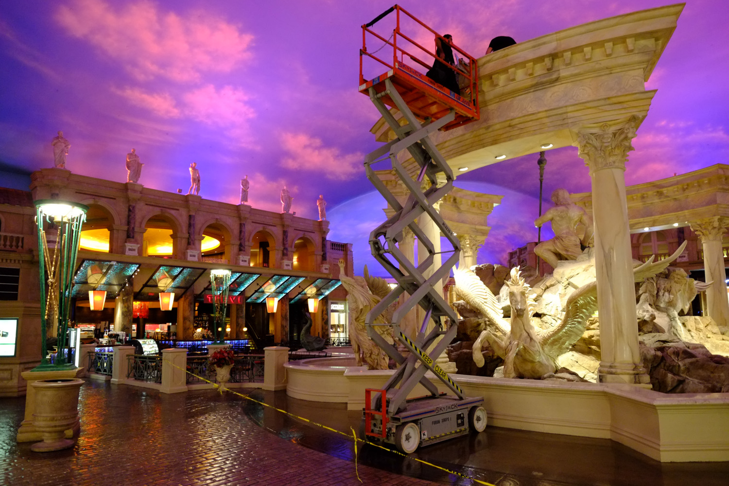 The early morning walk for breakfast gave us a fake sunrise over the fake Trevi fountain but I guess the maintenance guys were real. It takes a while to pass all the forum shops to get out of the hotel.