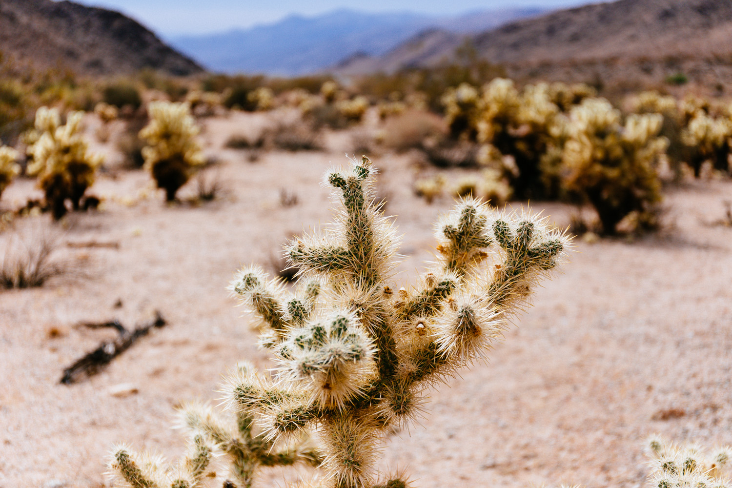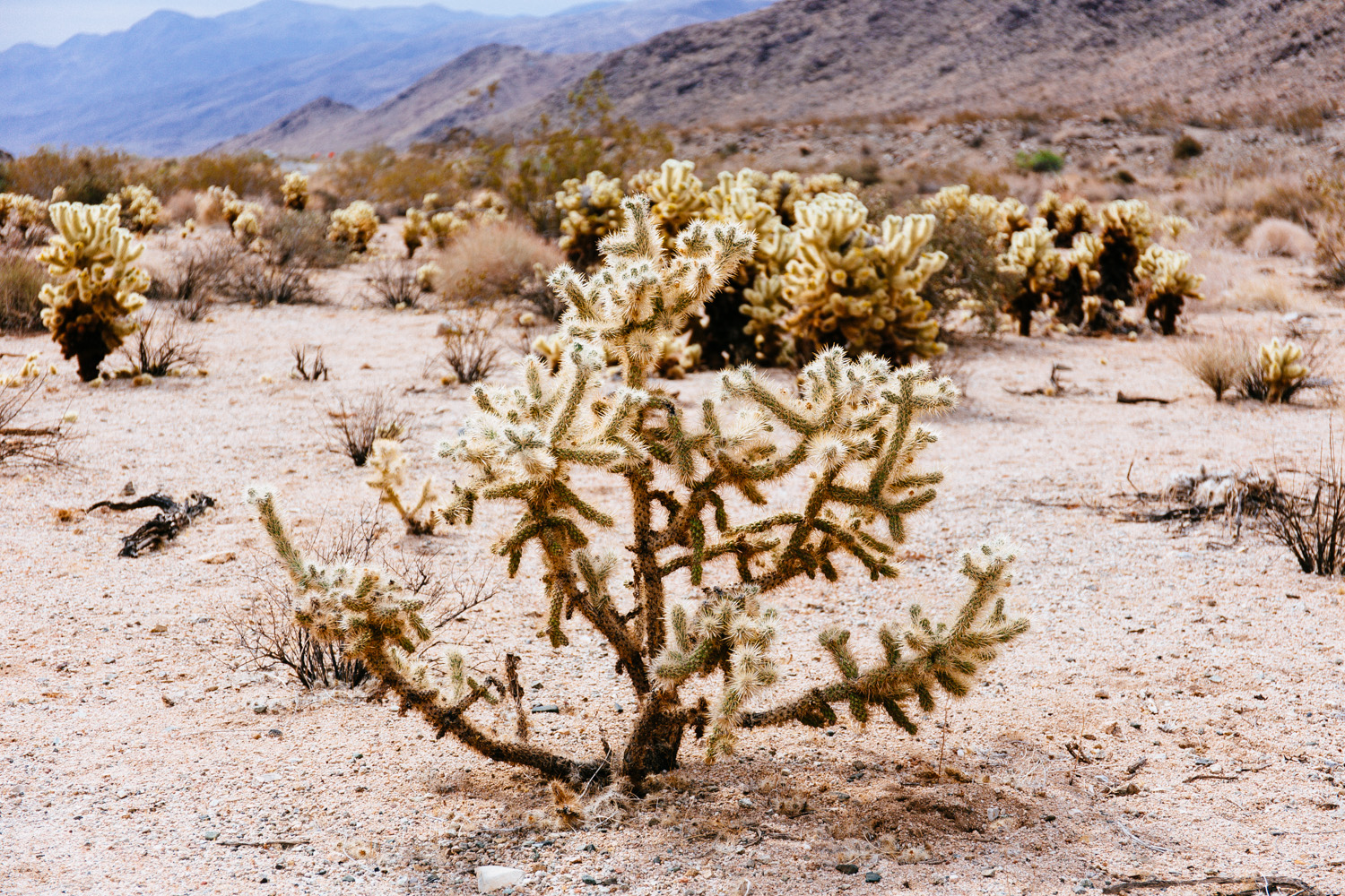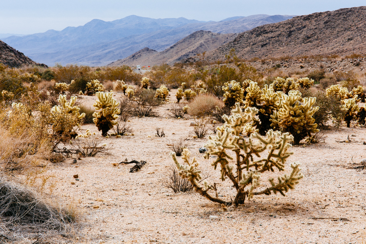 Because of massive road works we left Joshua Tree NP before we could visit the south part of it. We had to drive in a convoy because the road got a new surface. I guess they made the whole road in one single day. There was a big machine and on endless row of big trucks that brought the asphalt.