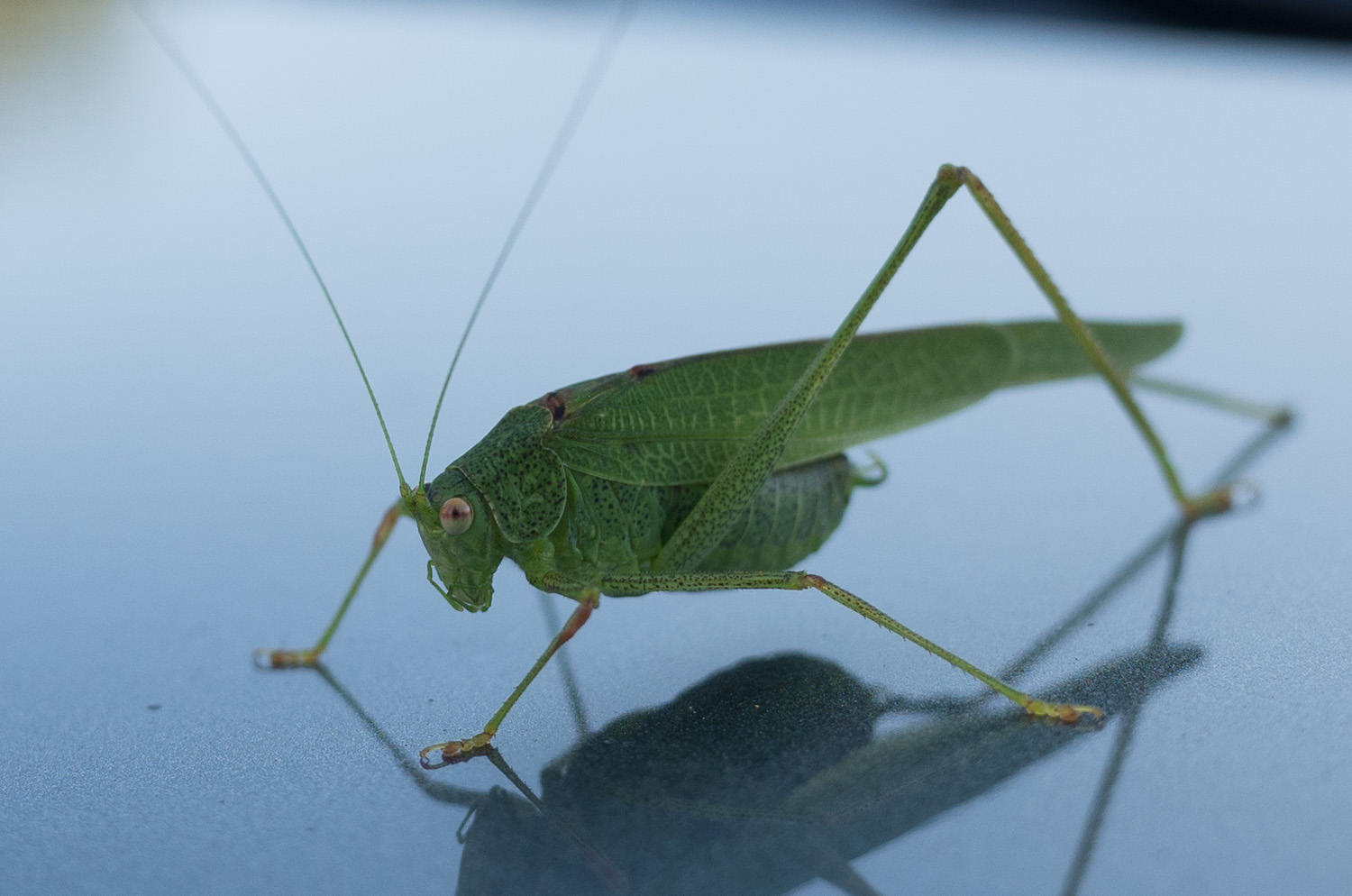 What’s so special, it’s just a grasshopper? Yes but not an ordinary one. When I came to my car the day before yesterday I found this little fellow on the hood of my car. I jumped in to get home sure that the grasshopper would jump off the car as soon as I start to drive. He didn’t. He did not even jump off at one of the stops before I entered the highway.