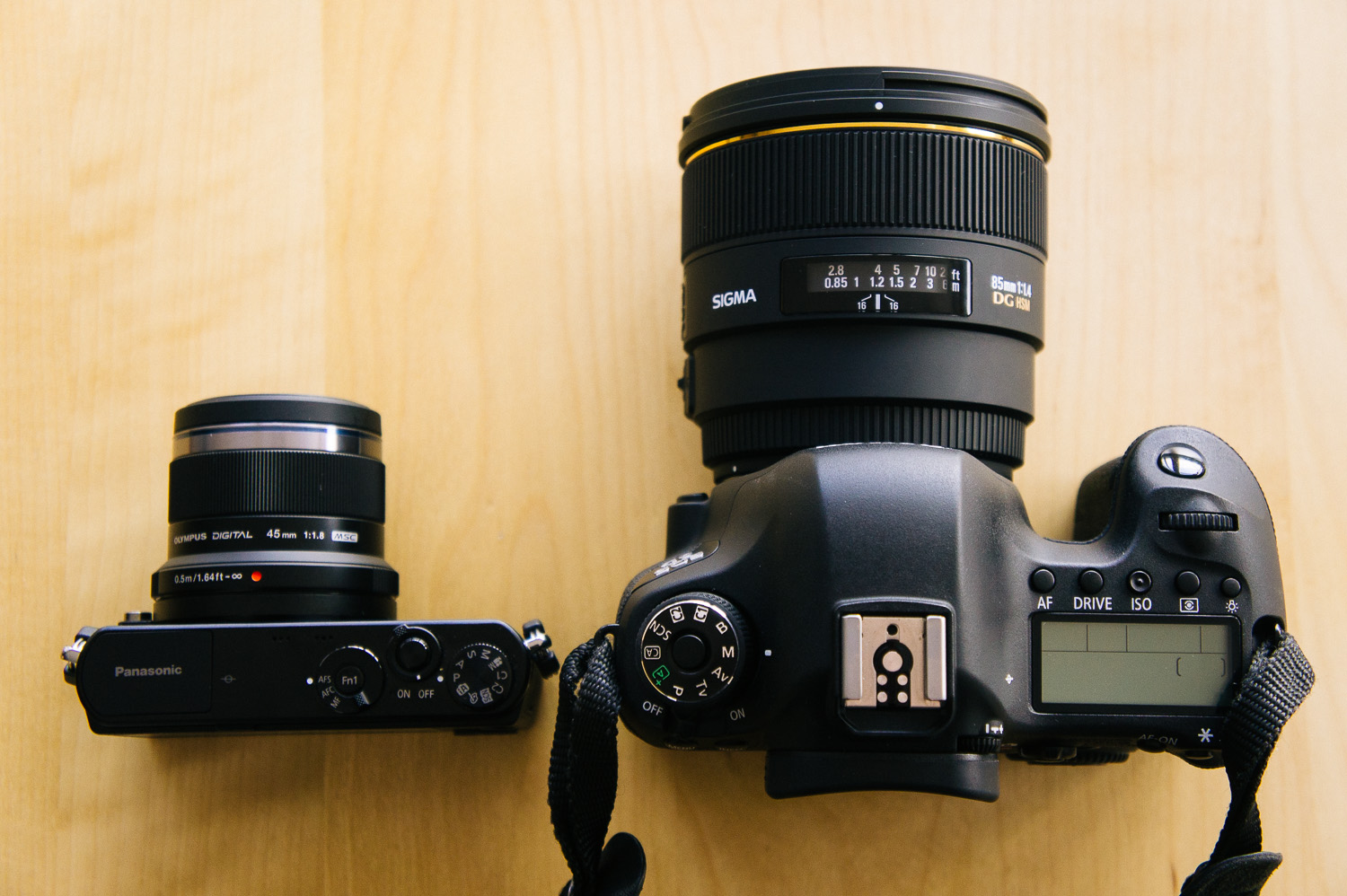 And here is the size comparison with the portrait lenses attached. The excellent 1.4/85 from Sigma on my Canon 6D and the very impressive 1.8/45 Olympus on the GM 1.