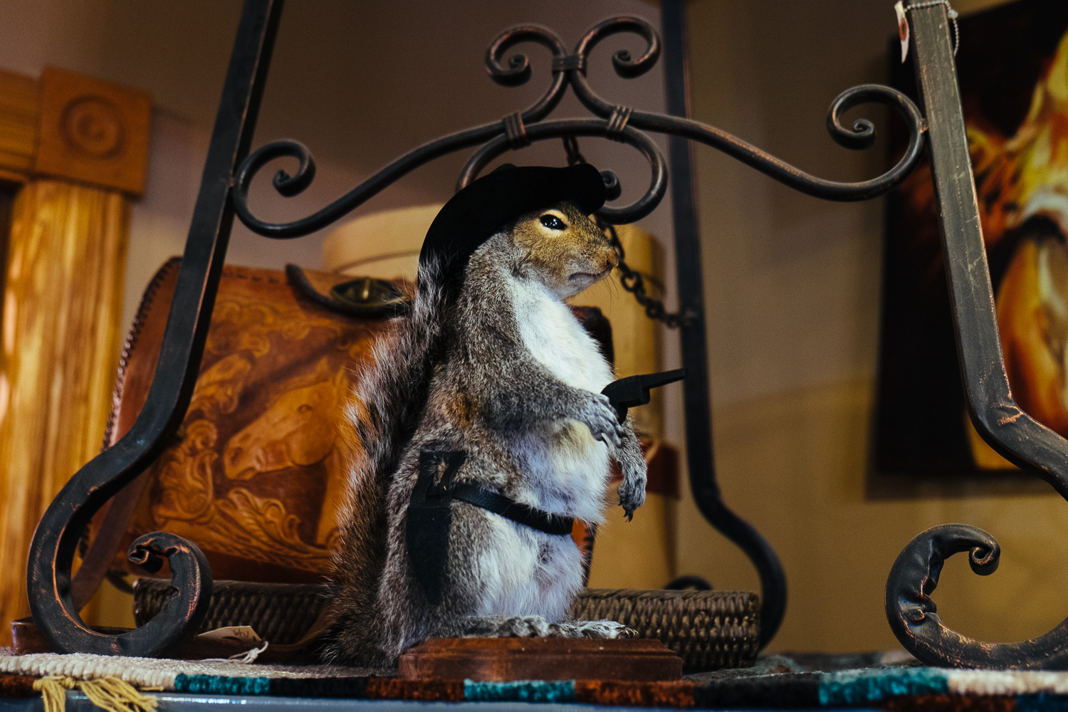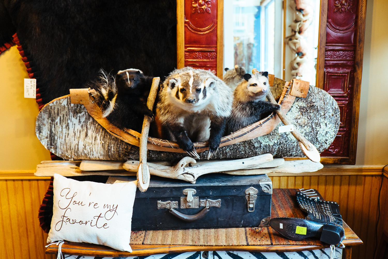 While a raccoon clinging on a log or a fox on a root is nothing special a stuffed squirrel with revolver and cowboy hat is. Or a skunk, an american badger and an opossum in a canoe. Amazing!