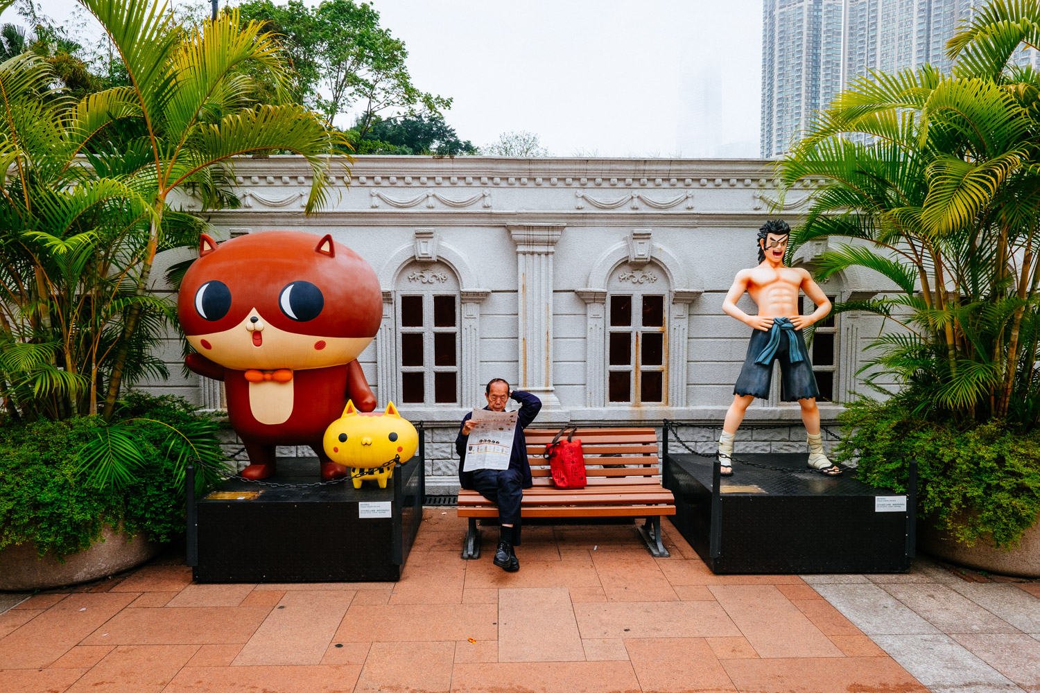 As a consequence none of the first images that I took and now posted here belong together. I stumbled through Nathan Road into Kowloon park. I passed the Hongkong Avenue of Comic Stars which is a collection of super-sized bizarre comic heroes. I took a couple of shots there but my favorite was the old men on the bench reading the papers in between those strange comic stars.